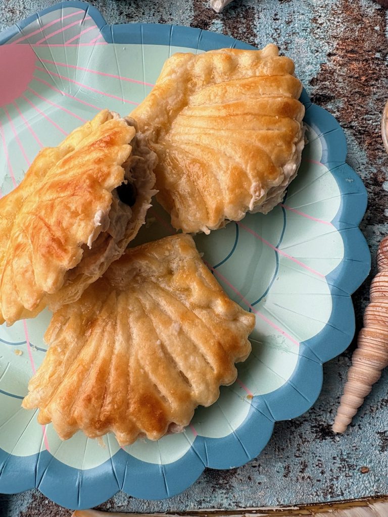 Serveer de bladerdeegschelpen als borrelhapje, voorgerecht of als onderdeel van een buffet of high tea. De leuke kartonnen schelpenbordjes kocht ik bij Zeeman.